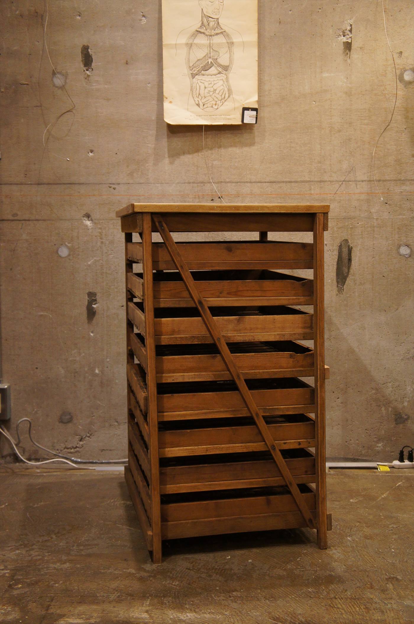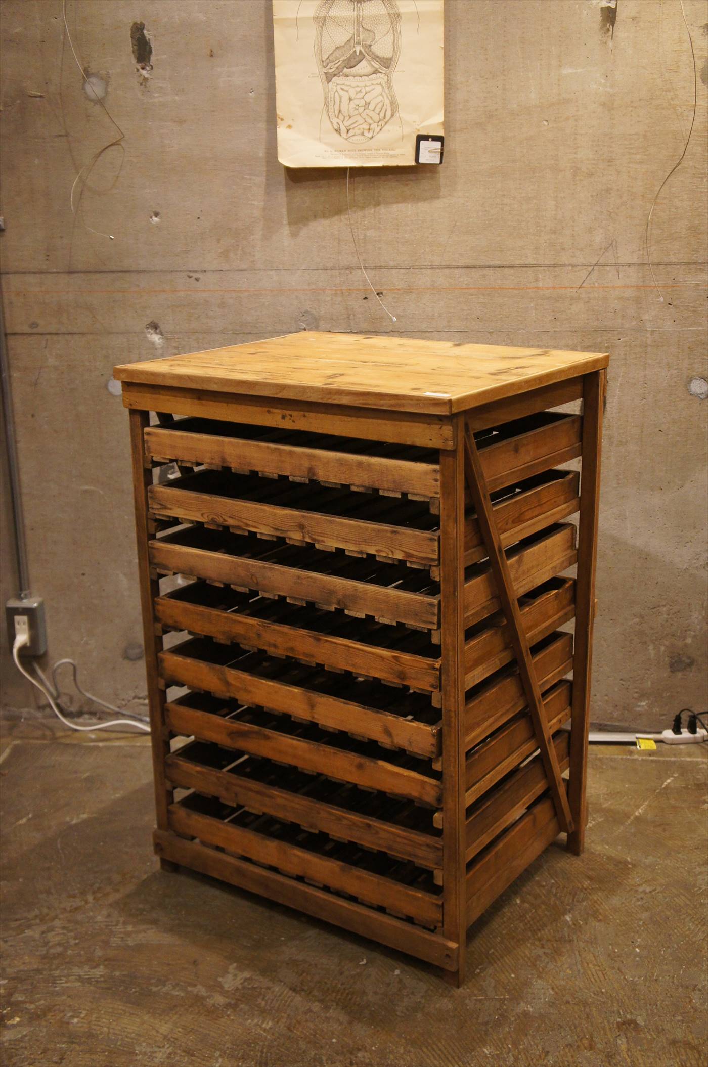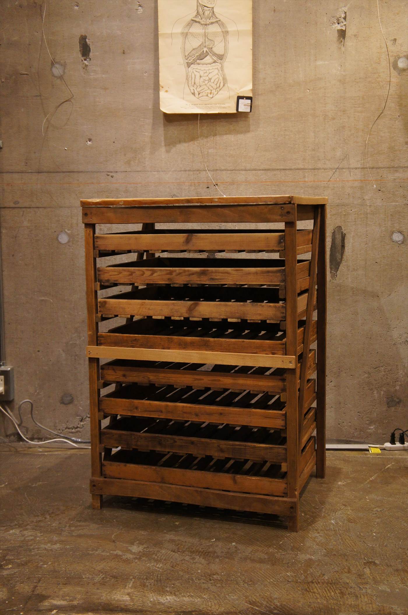 農業などの収穫物をいれるコンテナ、トレーを収納できるキャビネット。