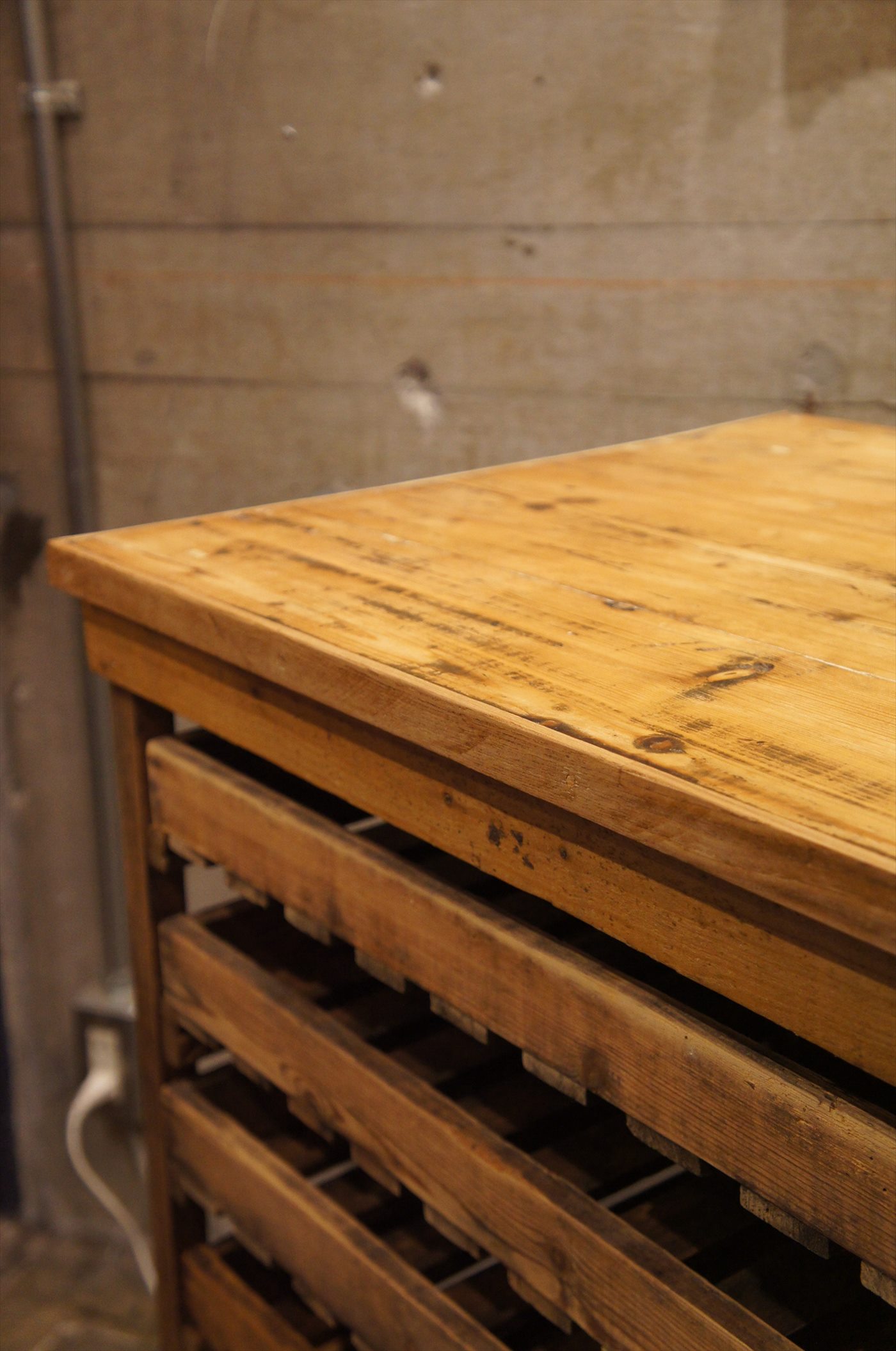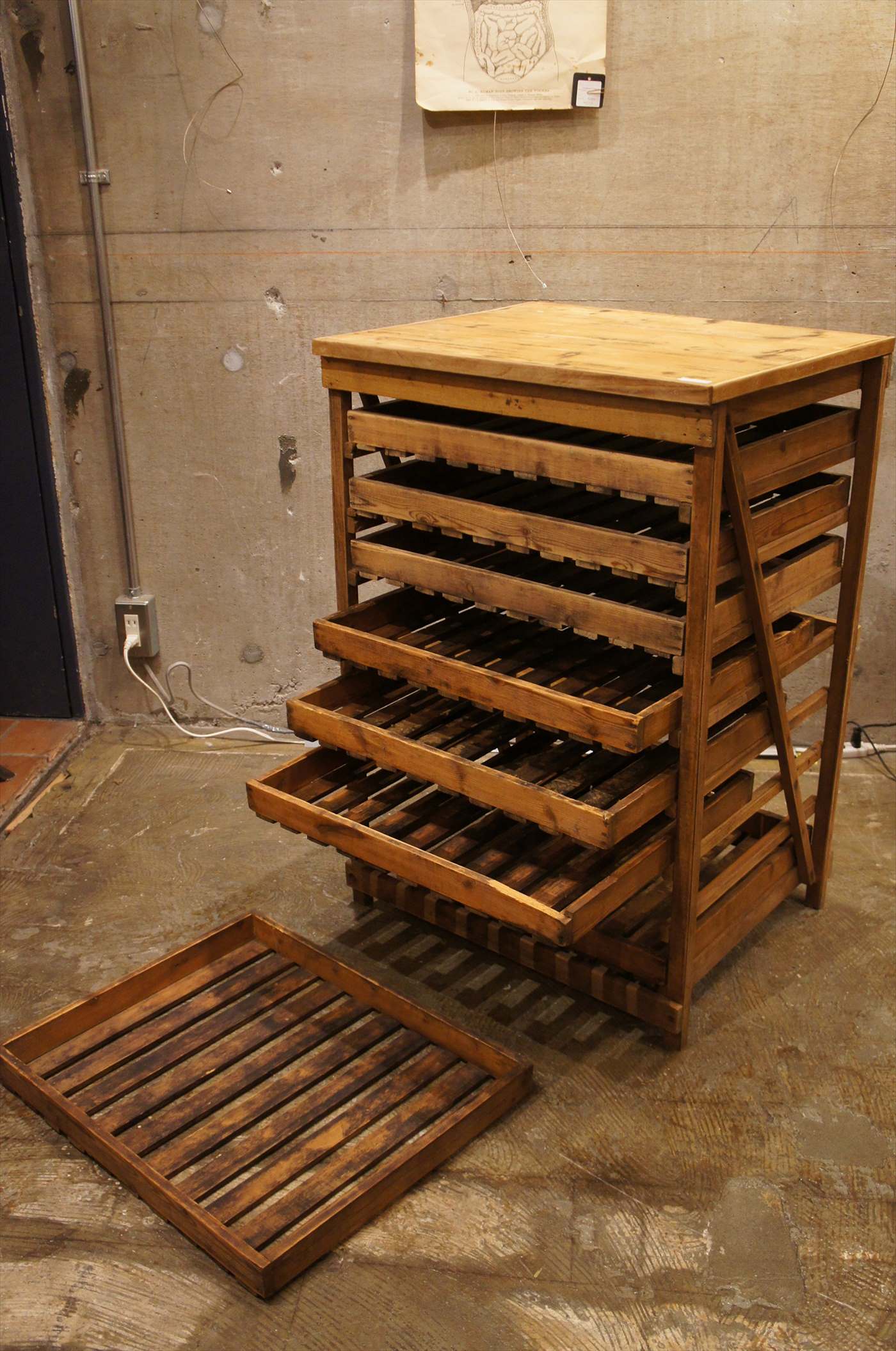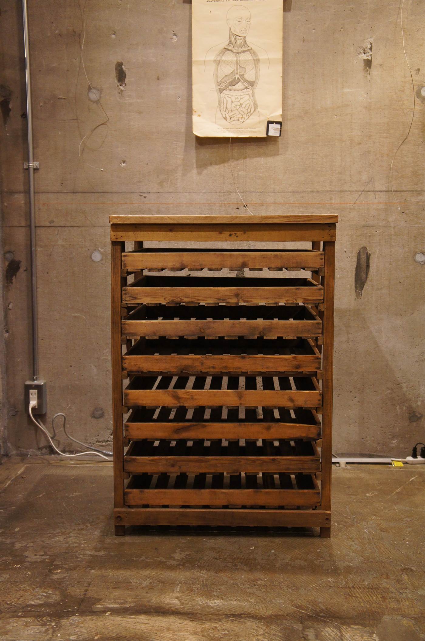農業などの収穫物をいれるコンテナ、トレーを収納できるキャビネット。