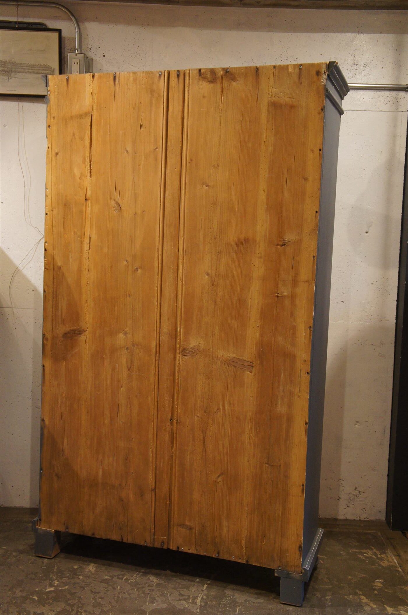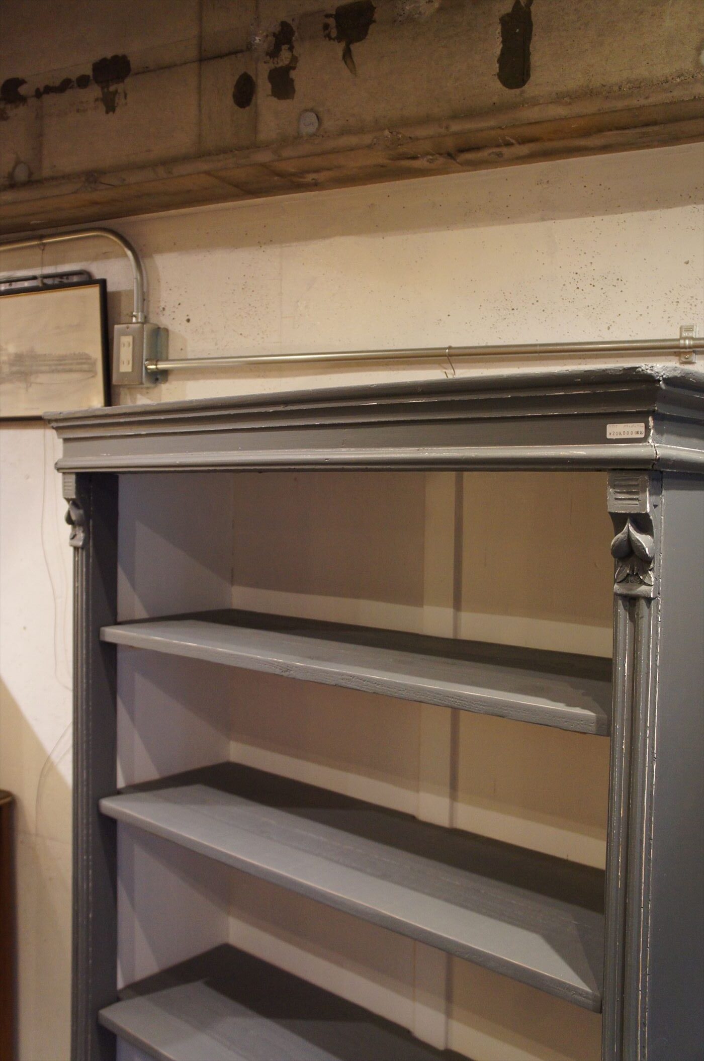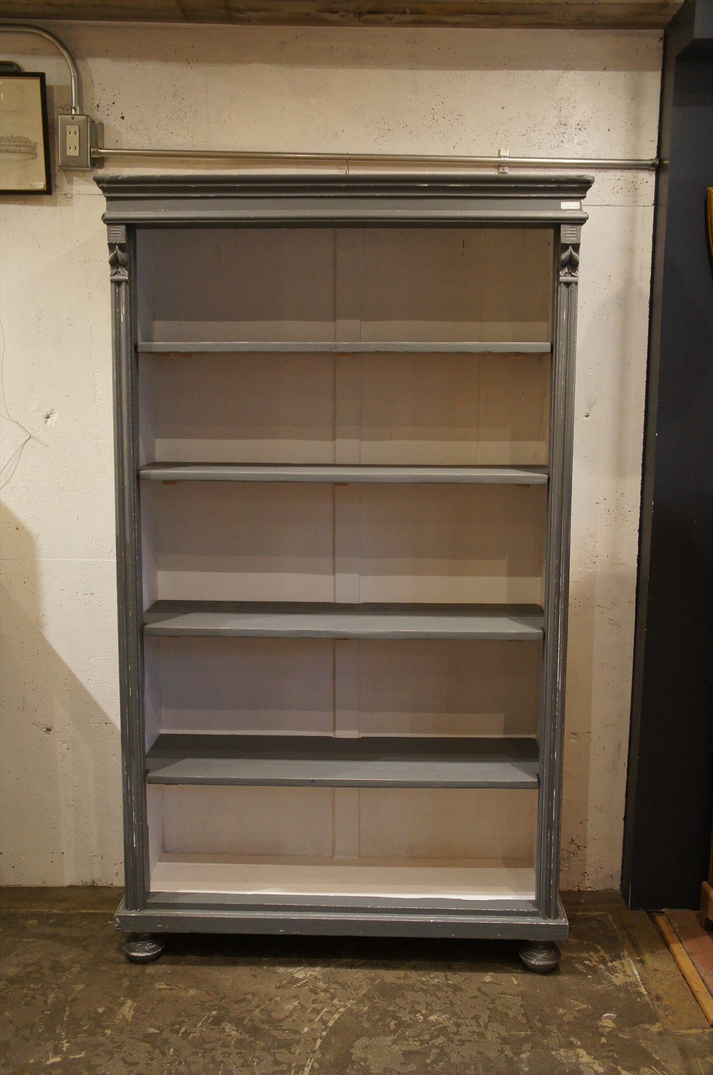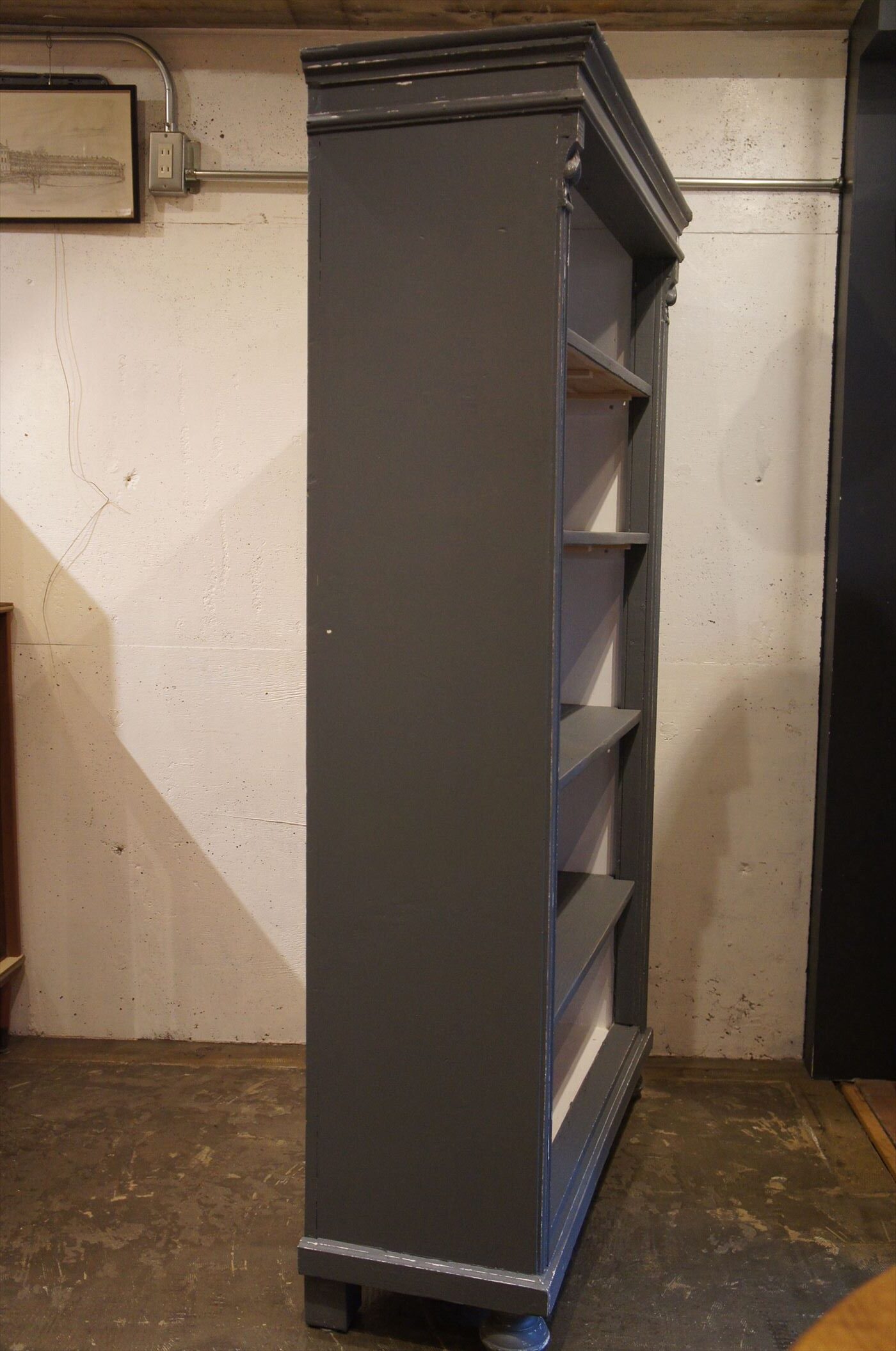 パイン材のブックシェルフに、グリーンが少し入ったグレーでペイントしてあります。