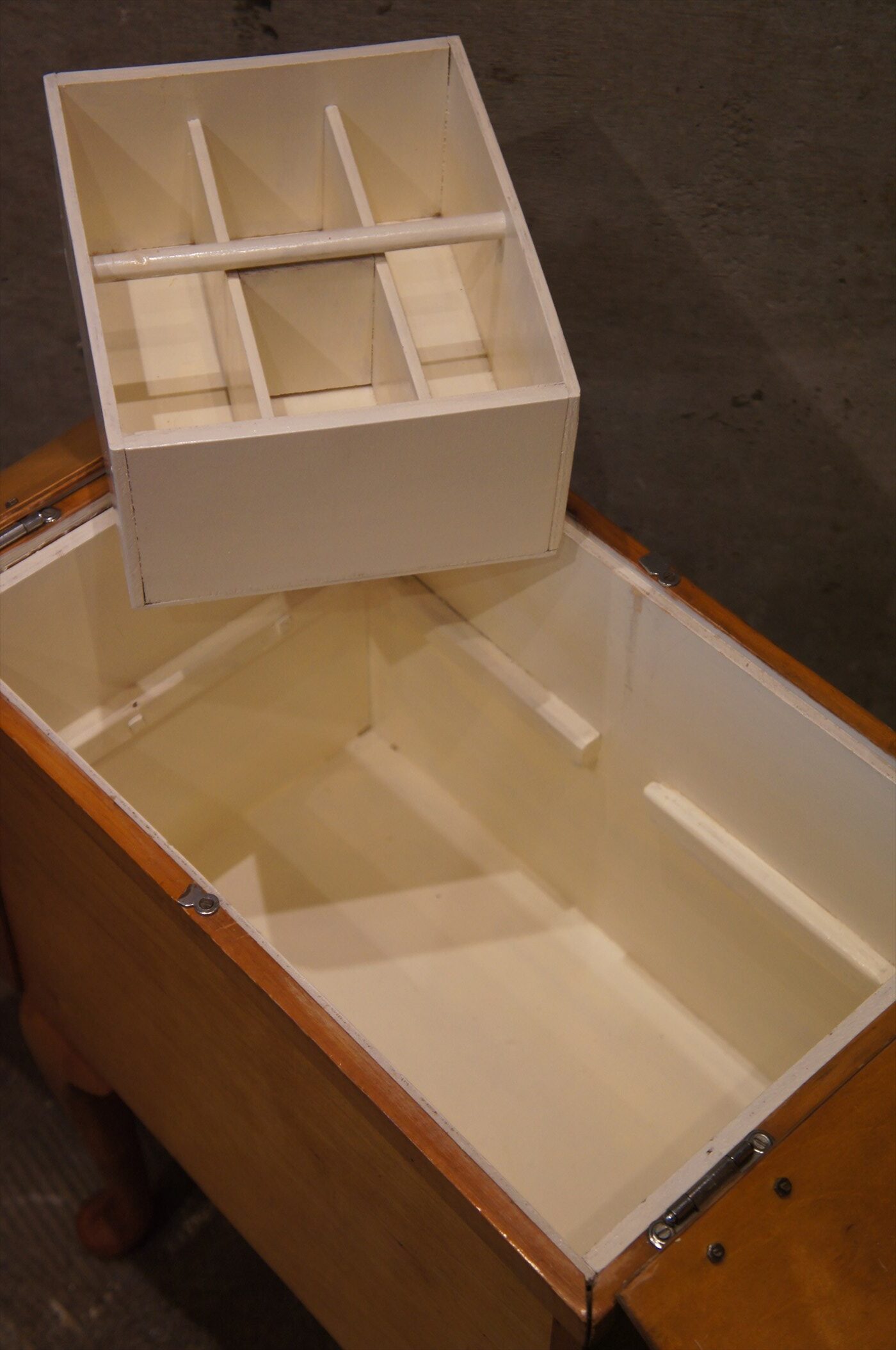天板部を開くと中は深く、収納になっており、中間には細かい仕切りのボックスも付属します。
