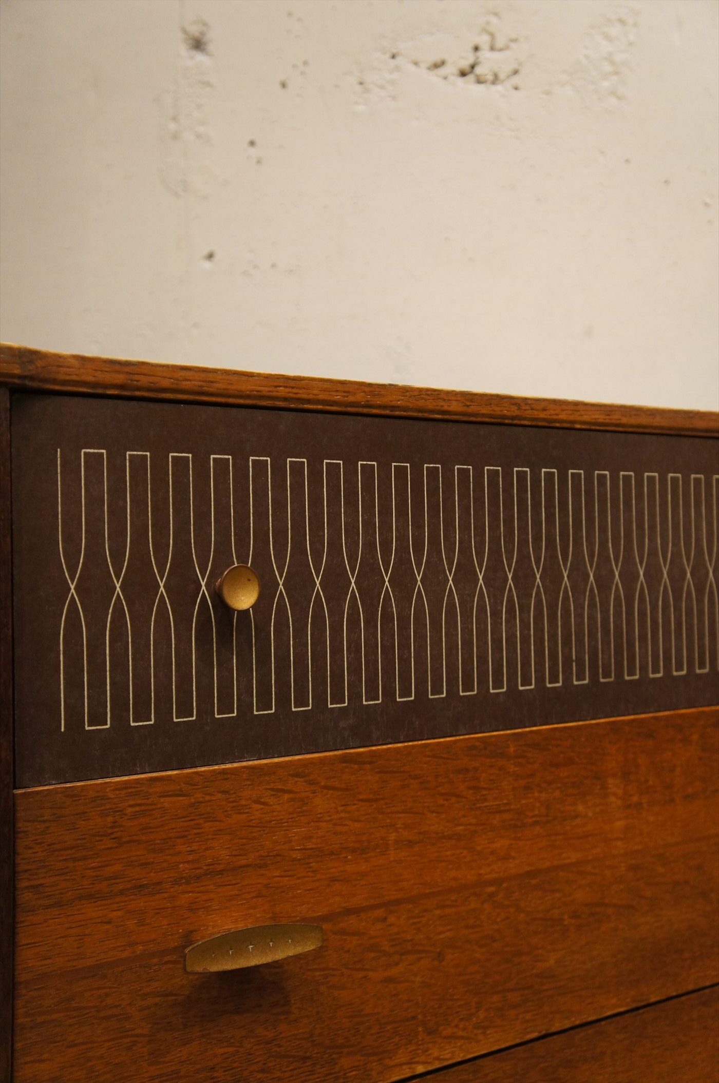 上部引き出しの前板にはフォーマイカ(昔の樹脂素材)が使用されており、レトロで特別感のあるデザイン