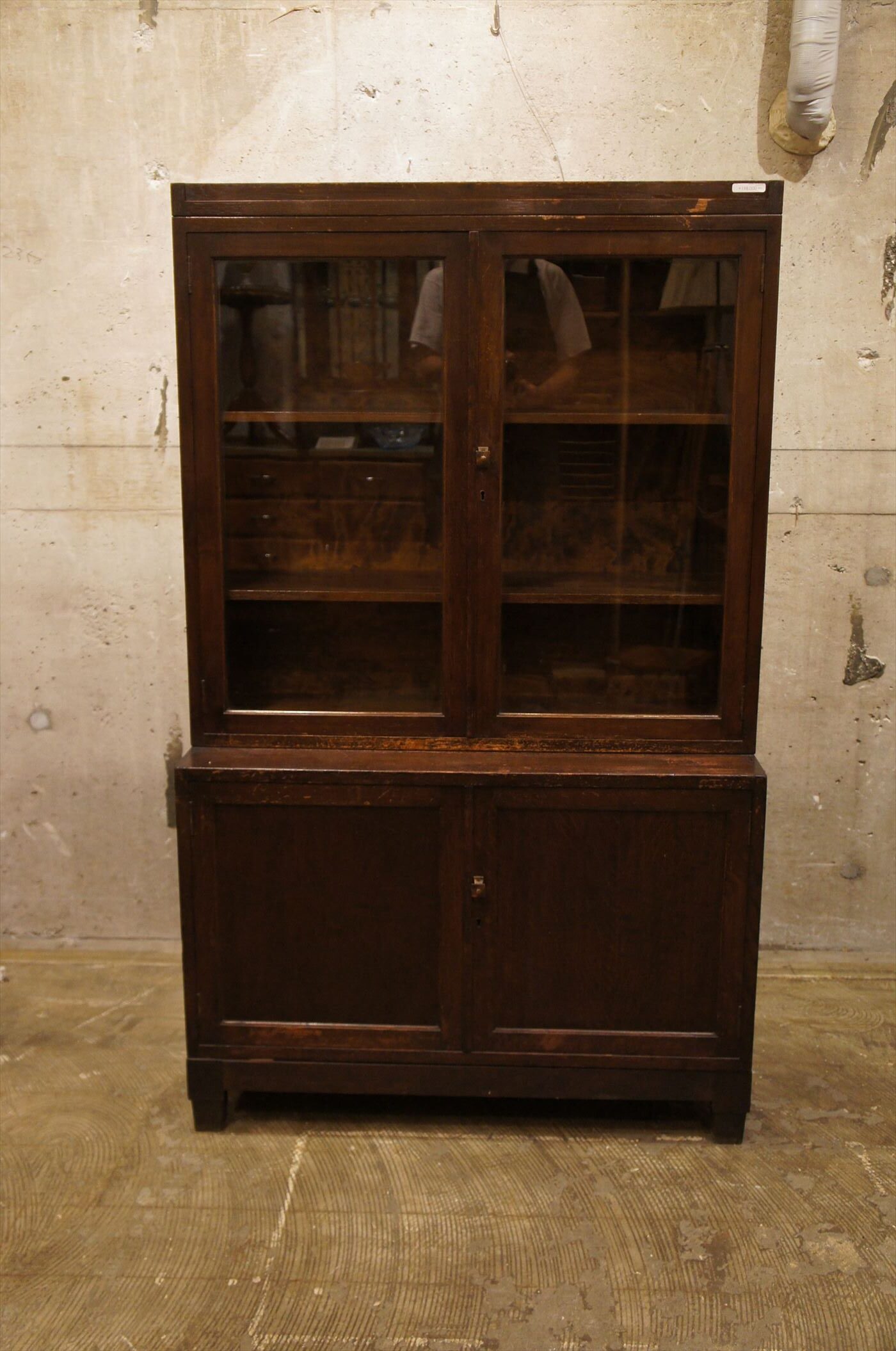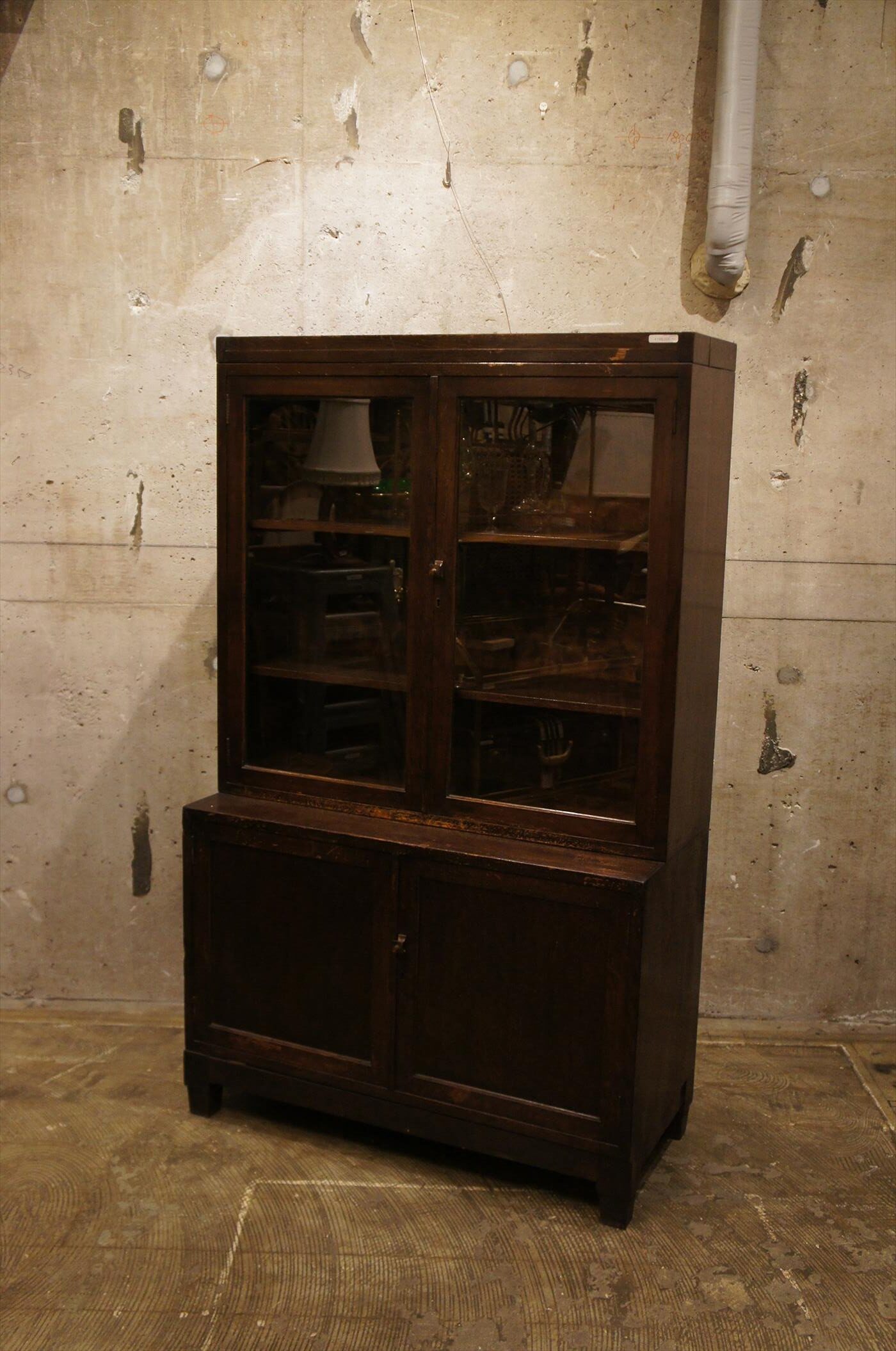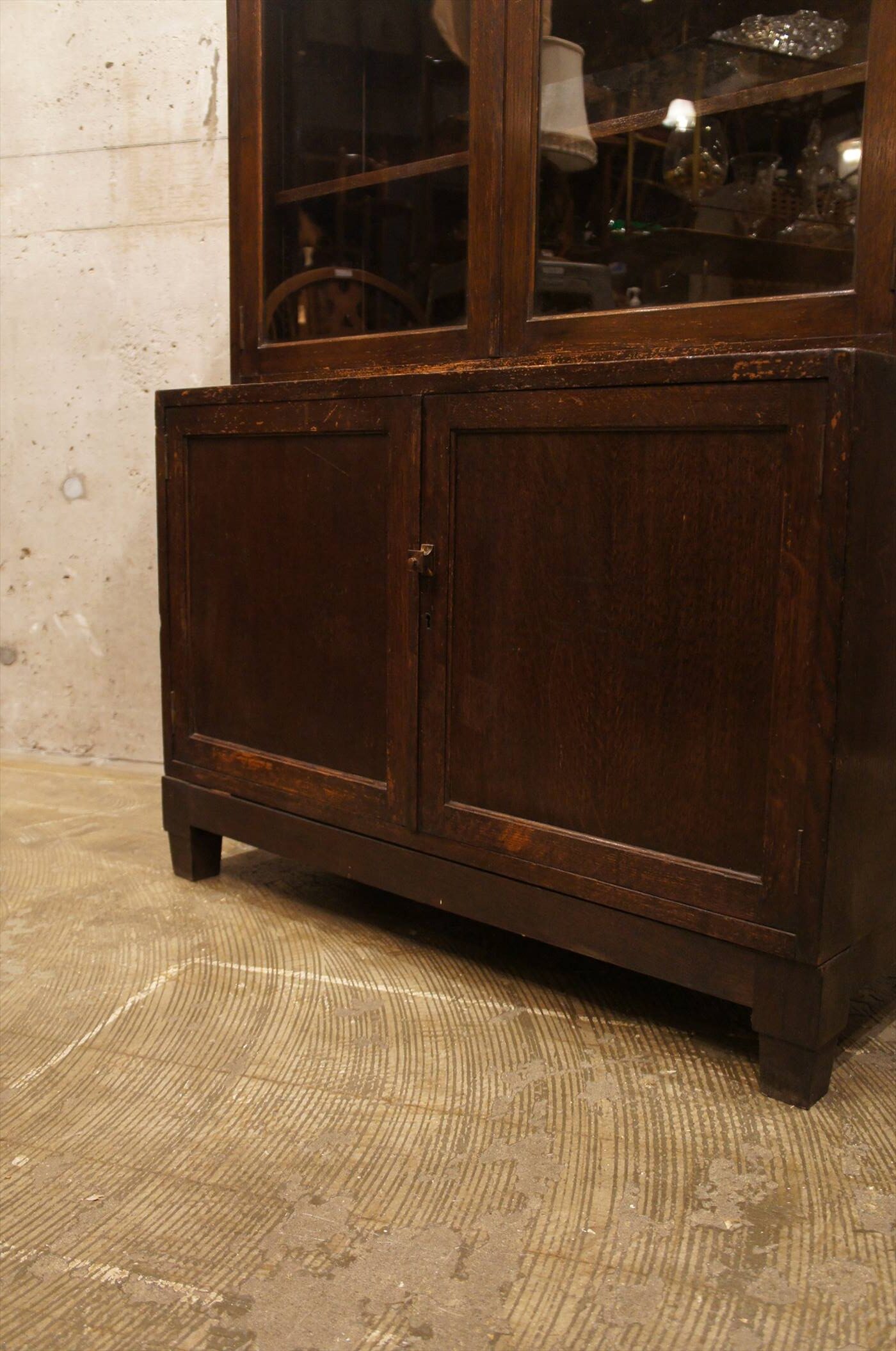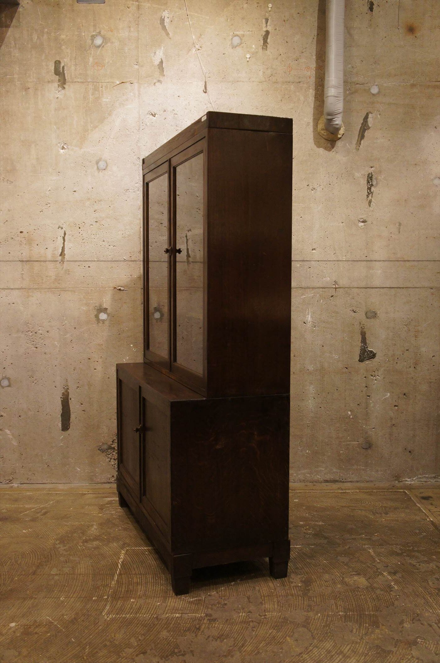 奥行きの違う、ガラス扉部と、収納部が積み重なっているデザインです。