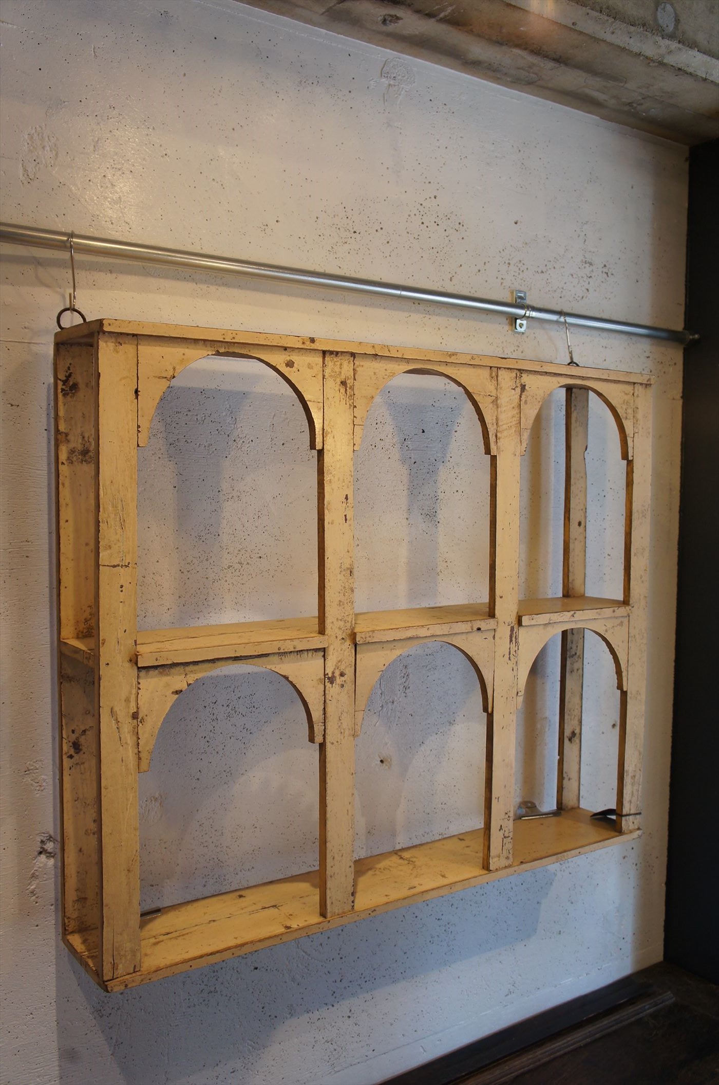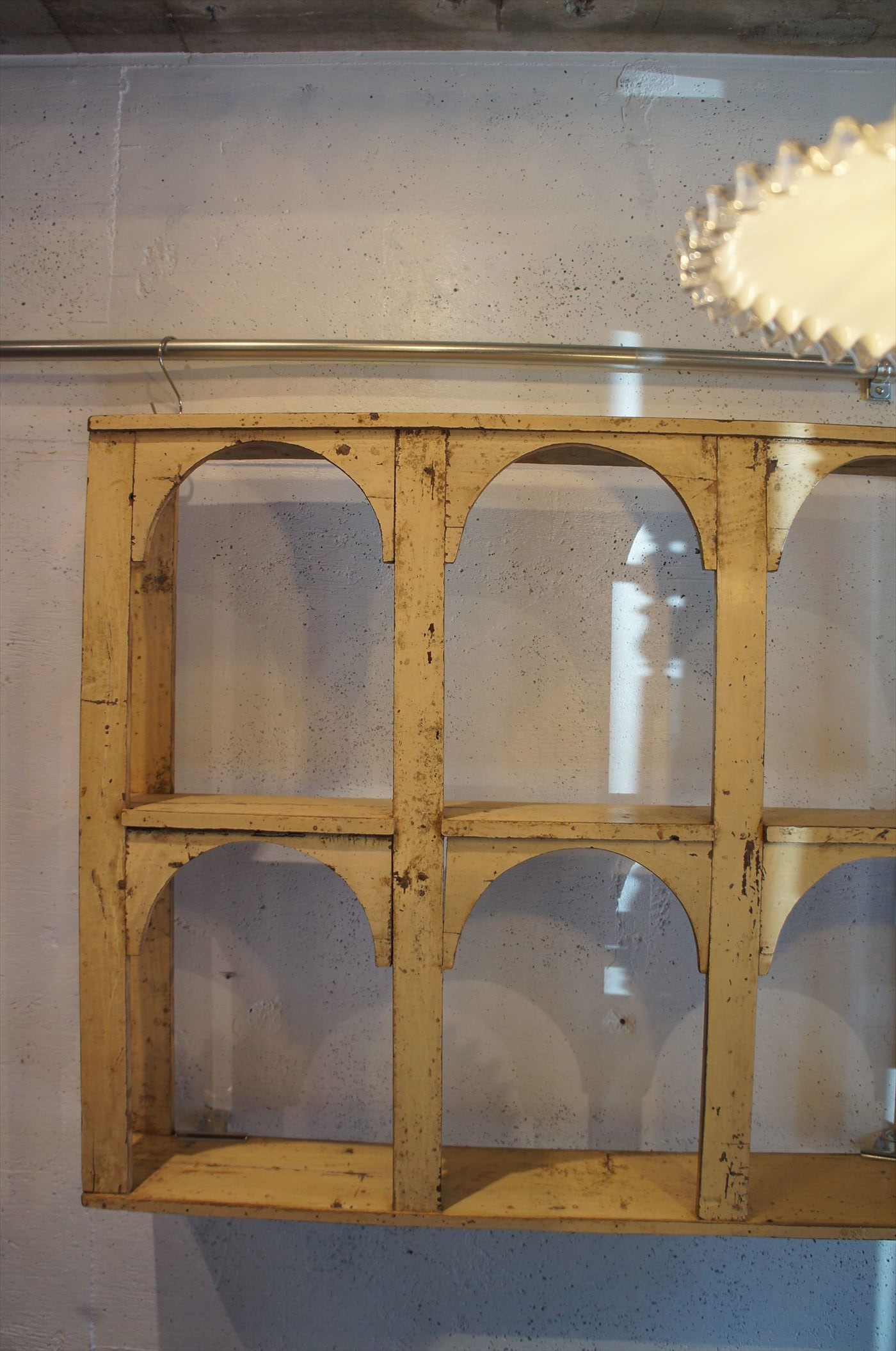 塗膜のはがれ具合。枠の装飾が、どこか東洋的なウォールシェルフ