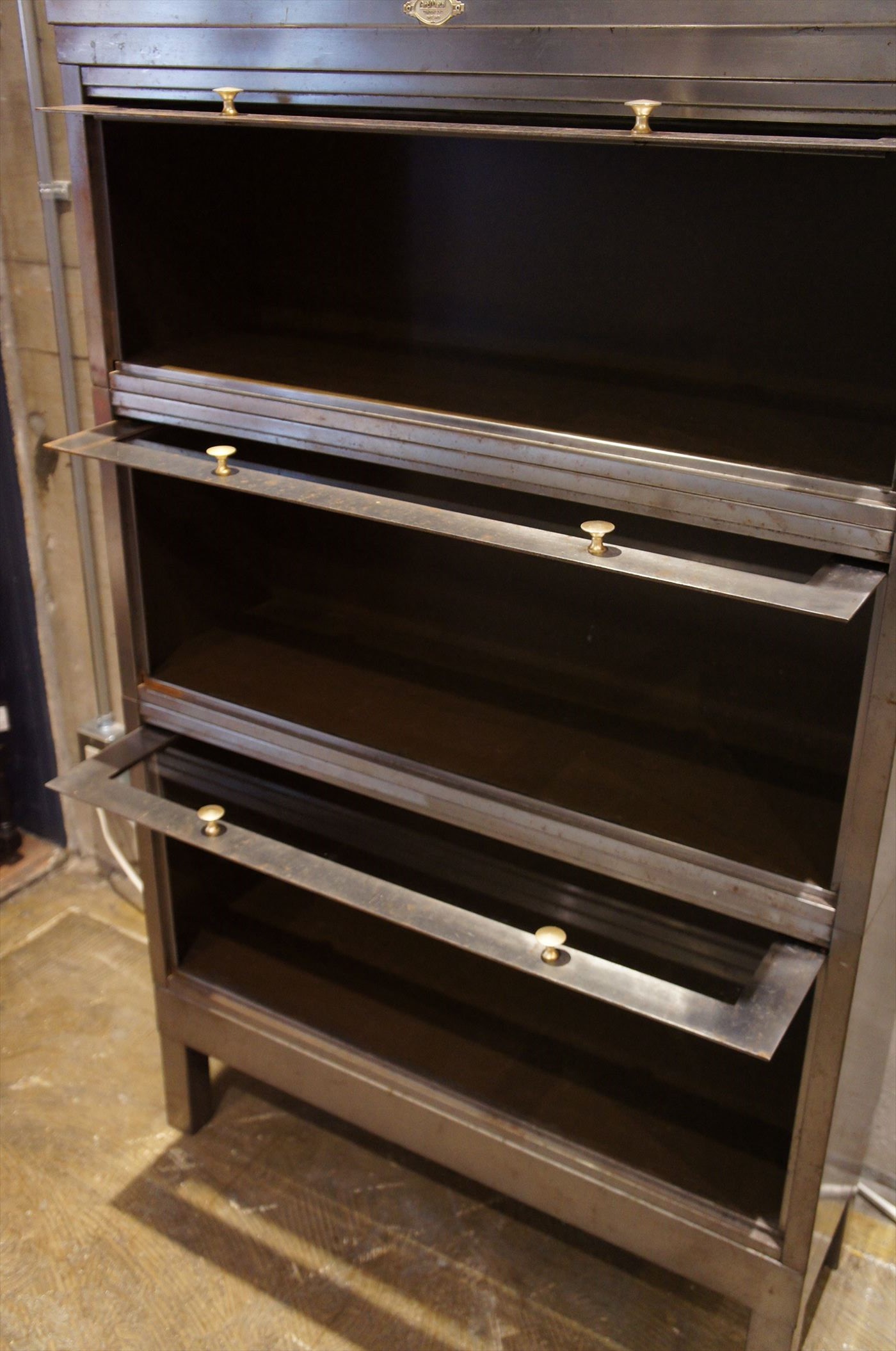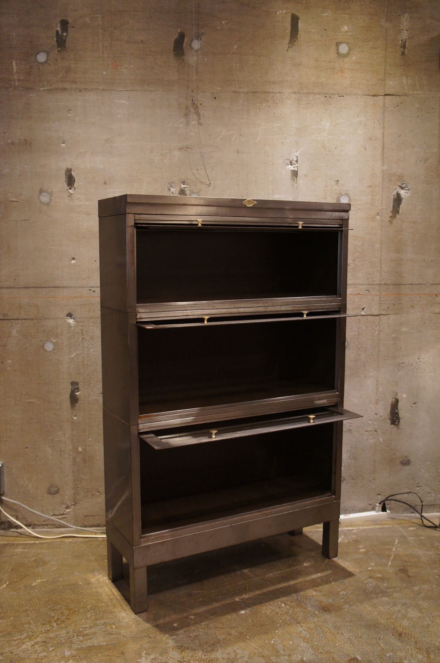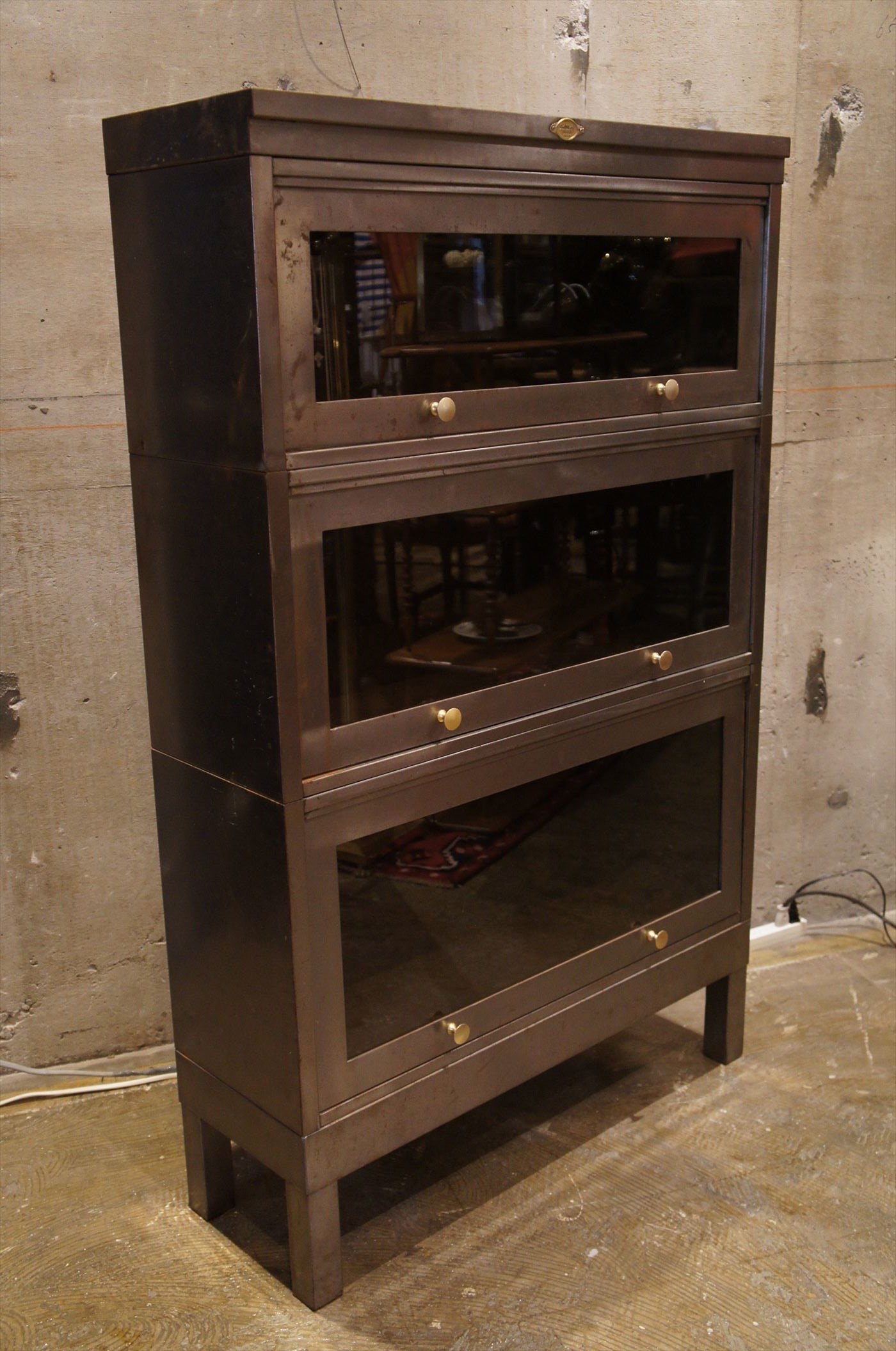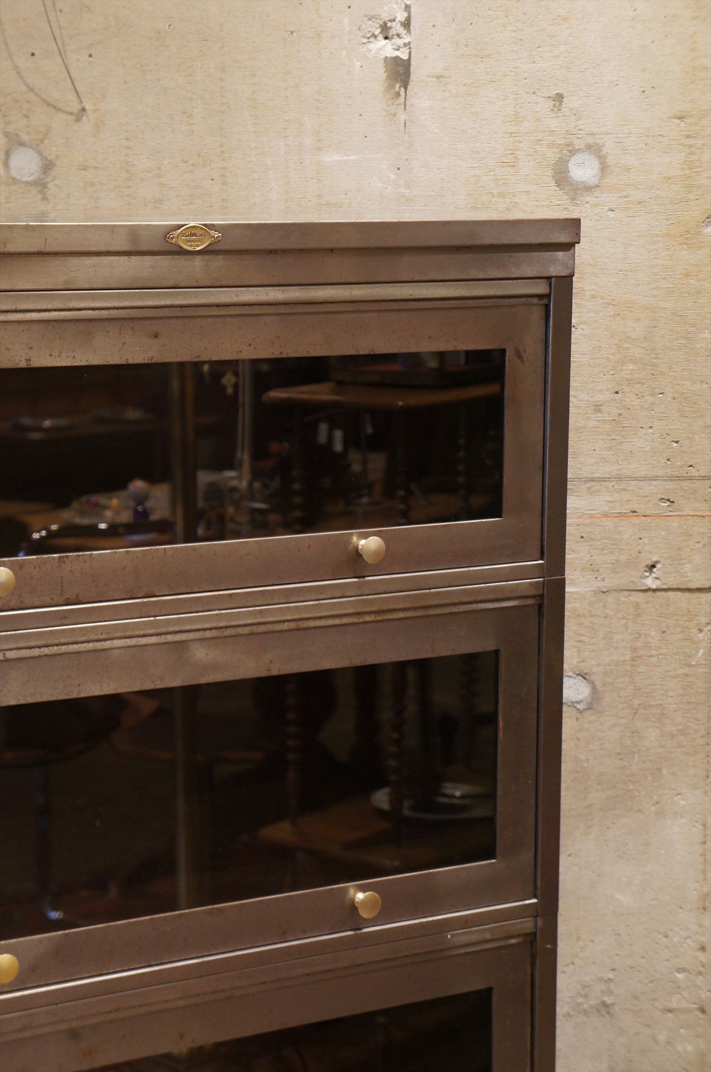 ガラス扉が手前に跳ね上げ、中に収納できる特徴的な形状のブックケース