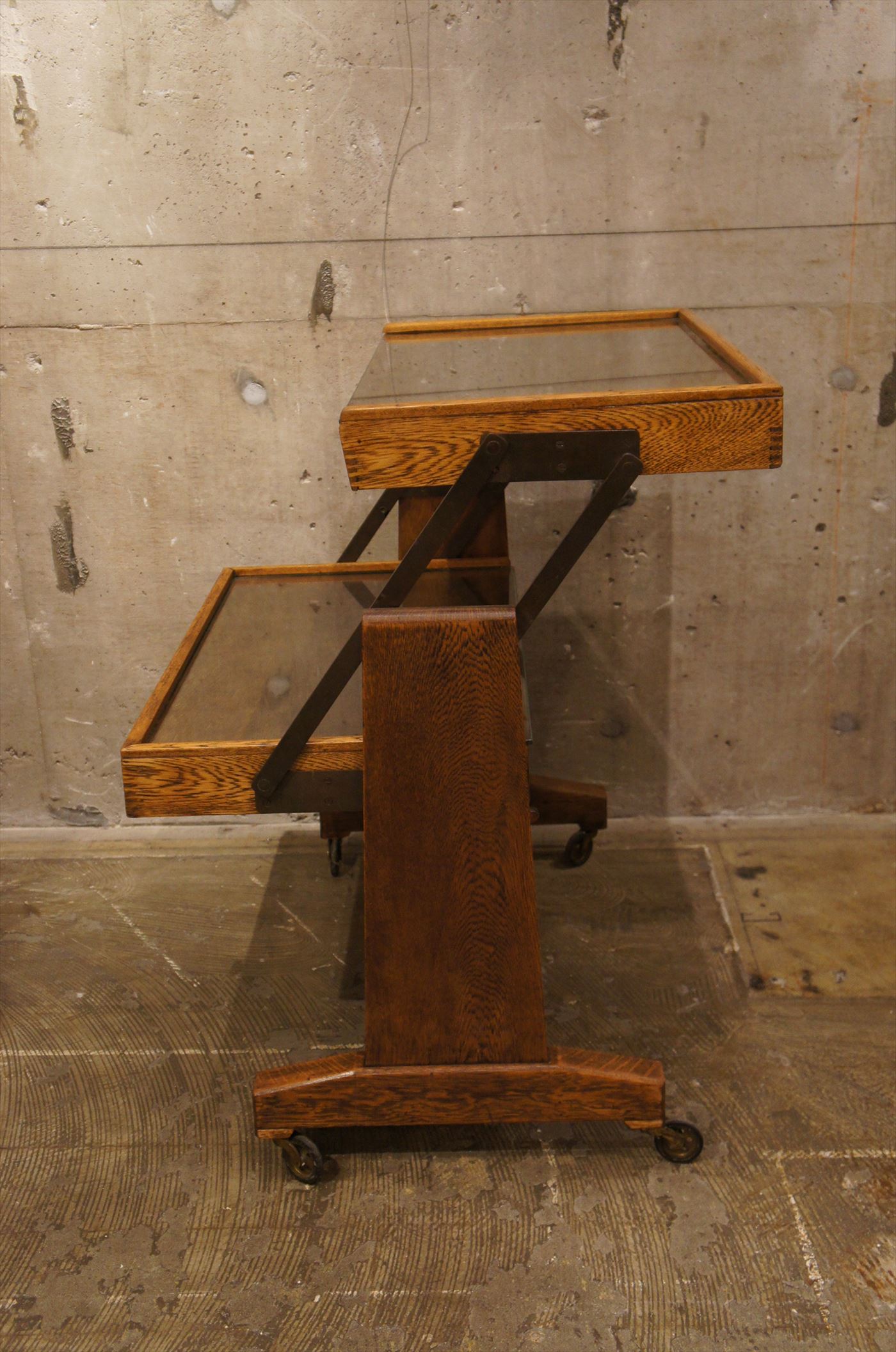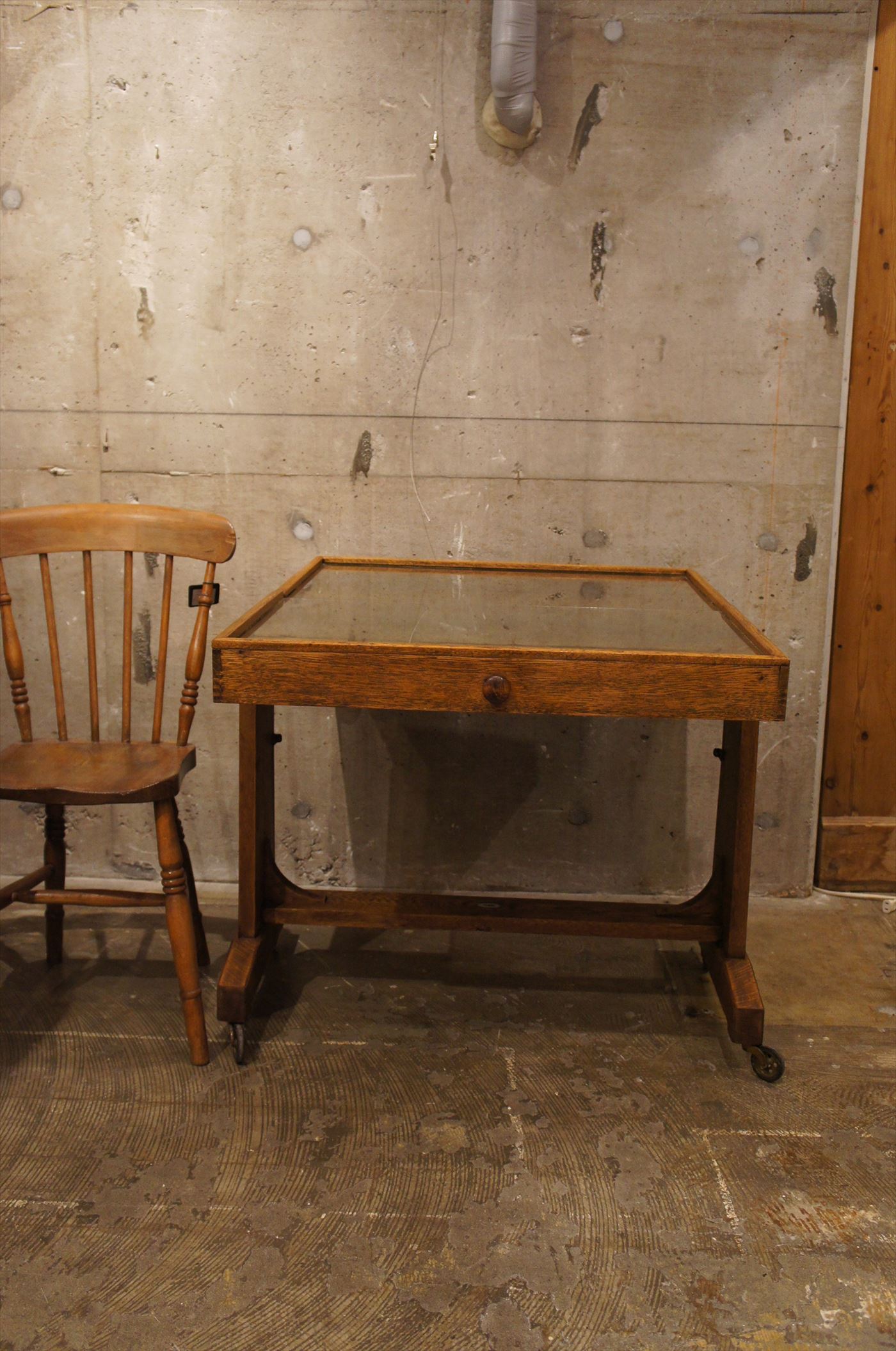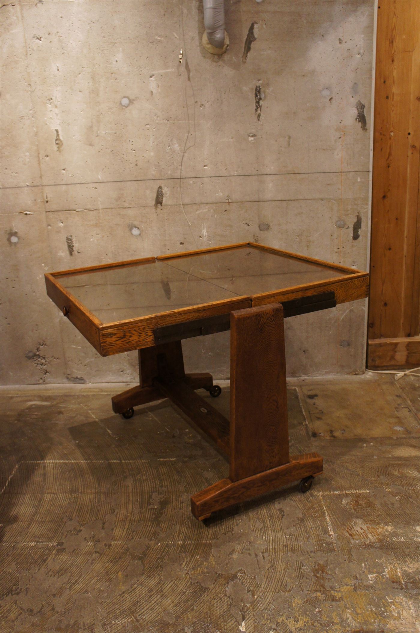 ガラス棚のシェルフでありながら、テーブルにもなるというアイテム。