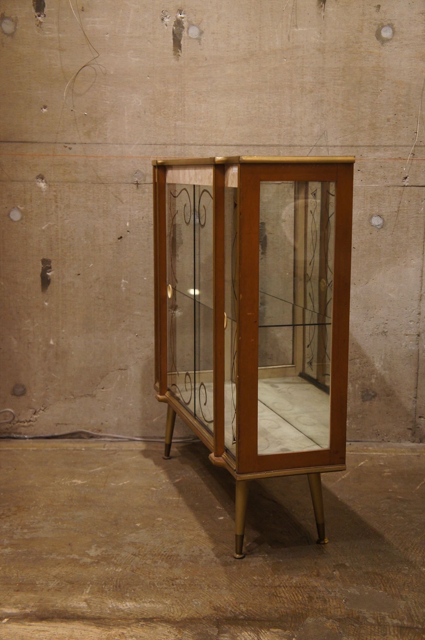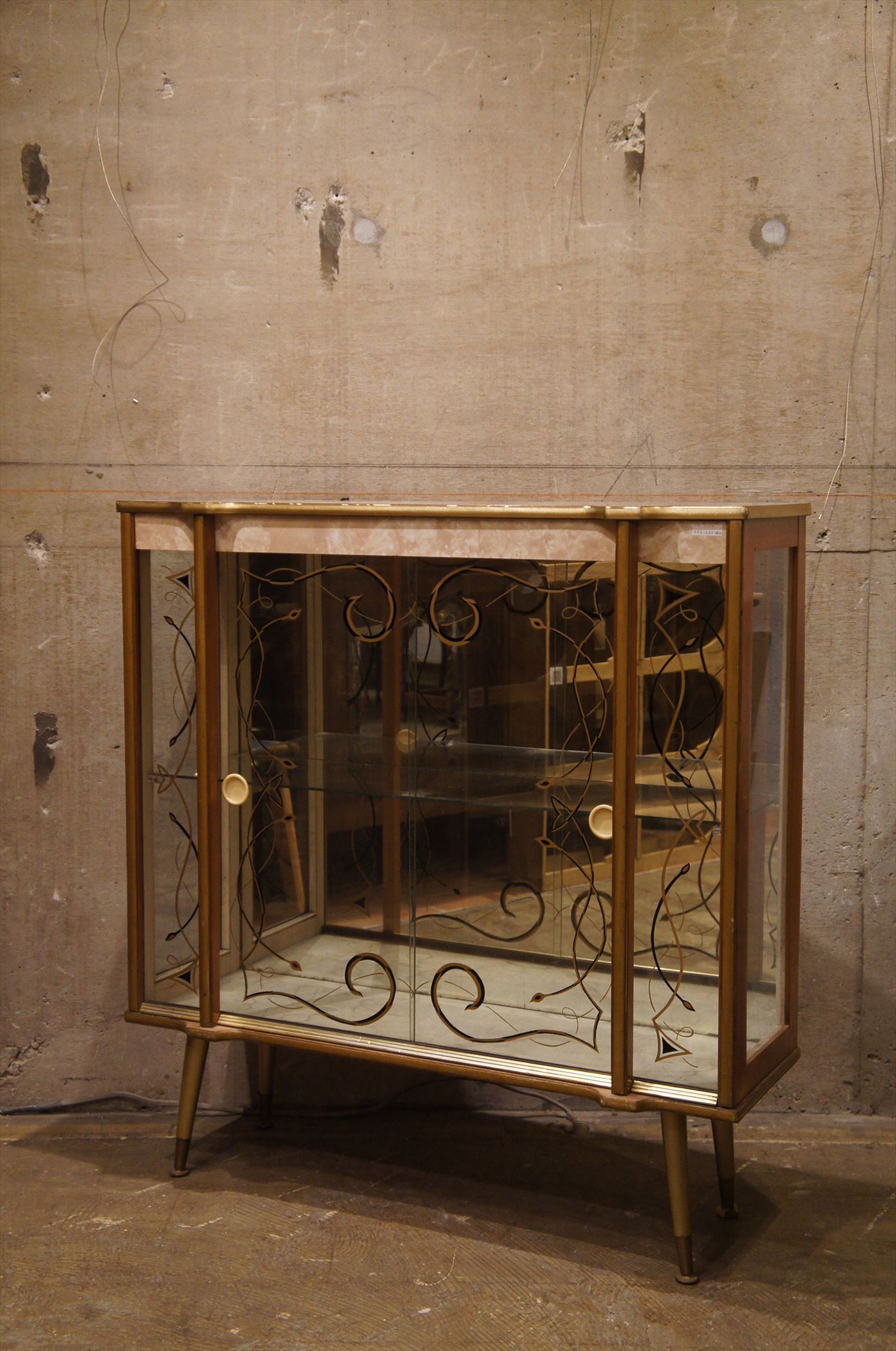 スマートな脚と、マーブル模様のトップ、パネル、ゴールドのトリム、ガラスのレタリングなど、なつかしくもスタイリッシュ。実用面でも、正面、側面はガラスで、採光に優れており、背面は鏡なので、飾る対象物がより美しく。奥行きが浅めなので、圧迫感も少なく、お部屋にインパクトを与えてくれます。