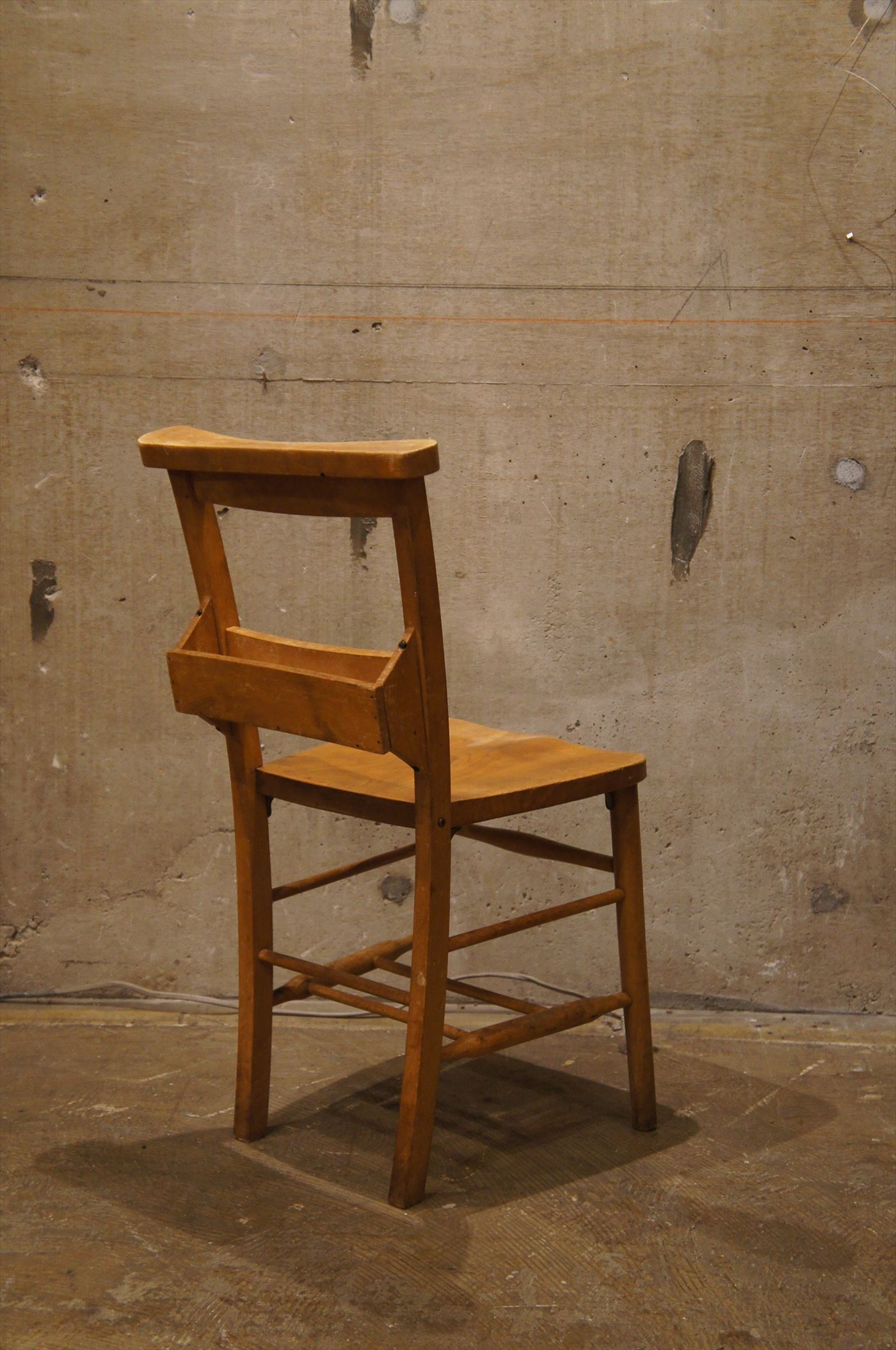 背面に聖書を入れるようのボックスが付属しており、背もたれは、後ろに座った人が、お祈り用に平らになっている合理的なデザイン。