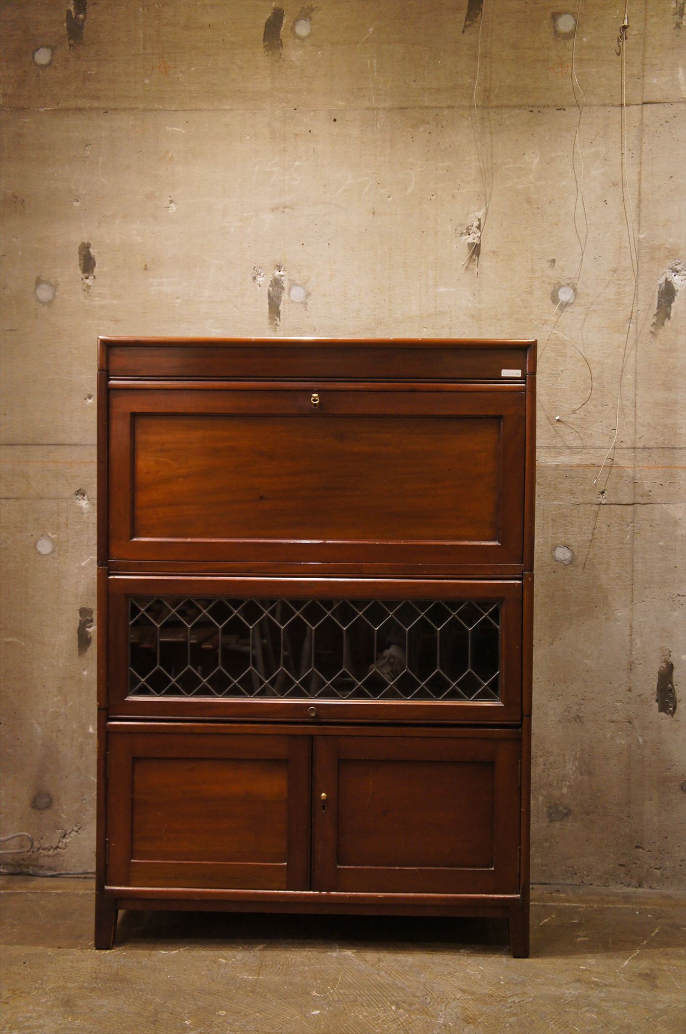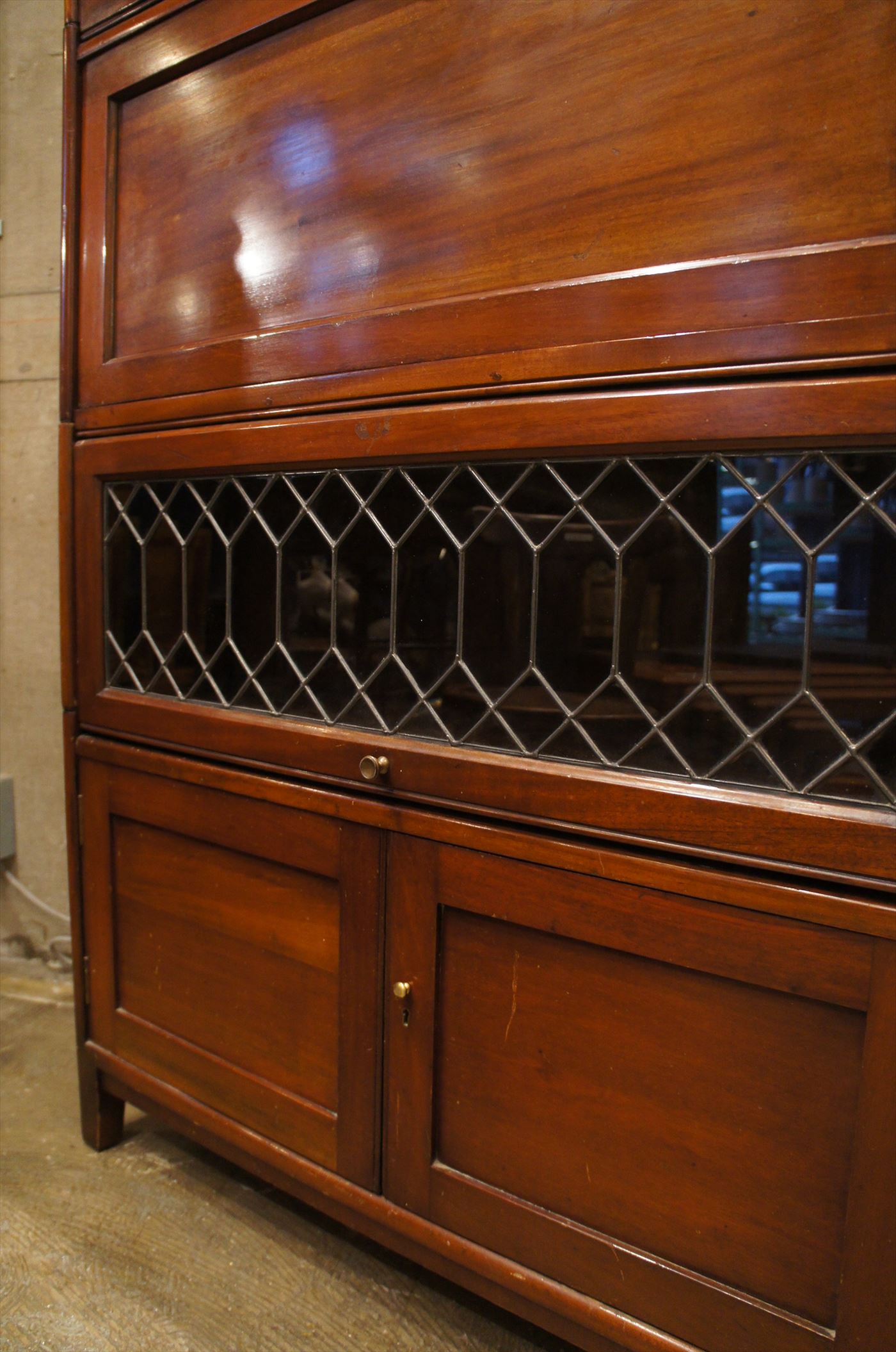 ブックケース部のガラスは、ステンドグラスタイプで鉛の縁取りがおしゃれ。扉は奥に収納できるので、開けたままでも使えます。