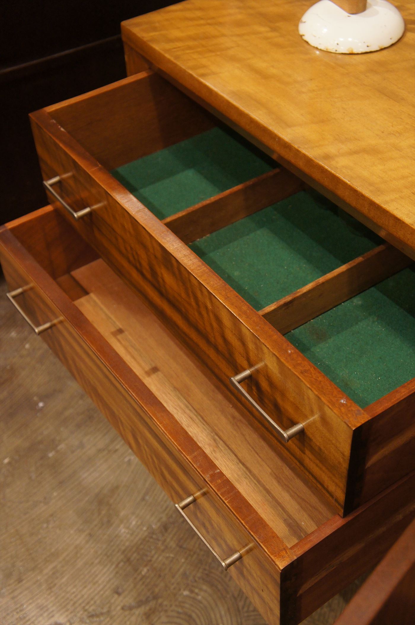 扉部はシンプルに大きな収納になっており、引き出し部は上段のみ、仕切りもあるので、様々な収納に対応