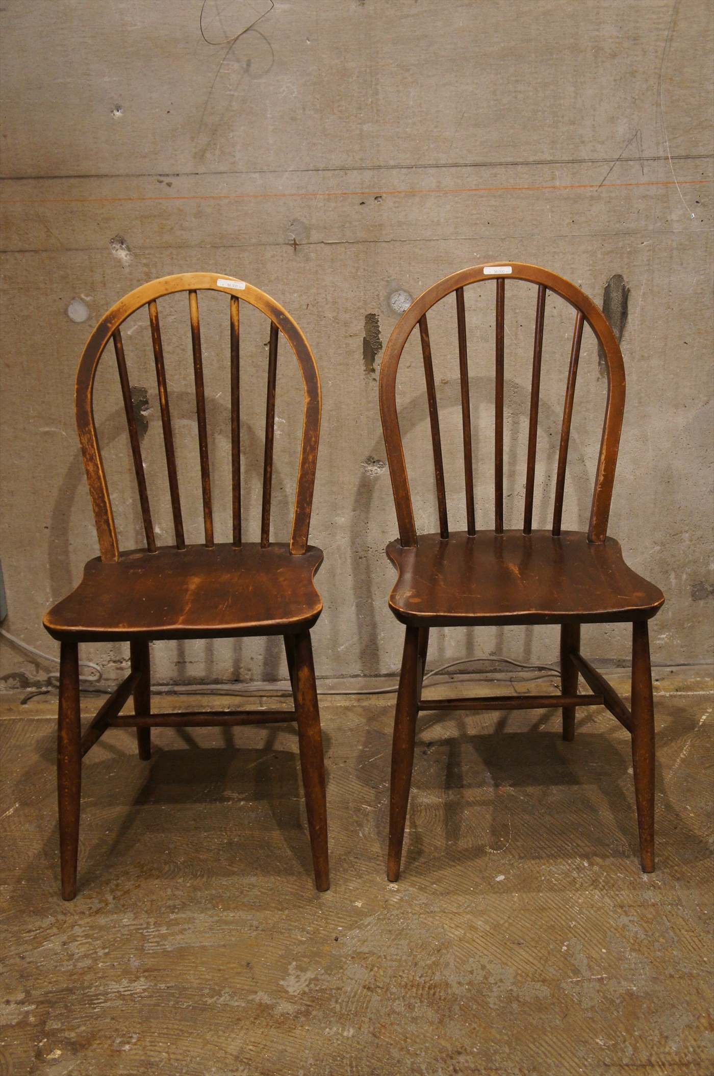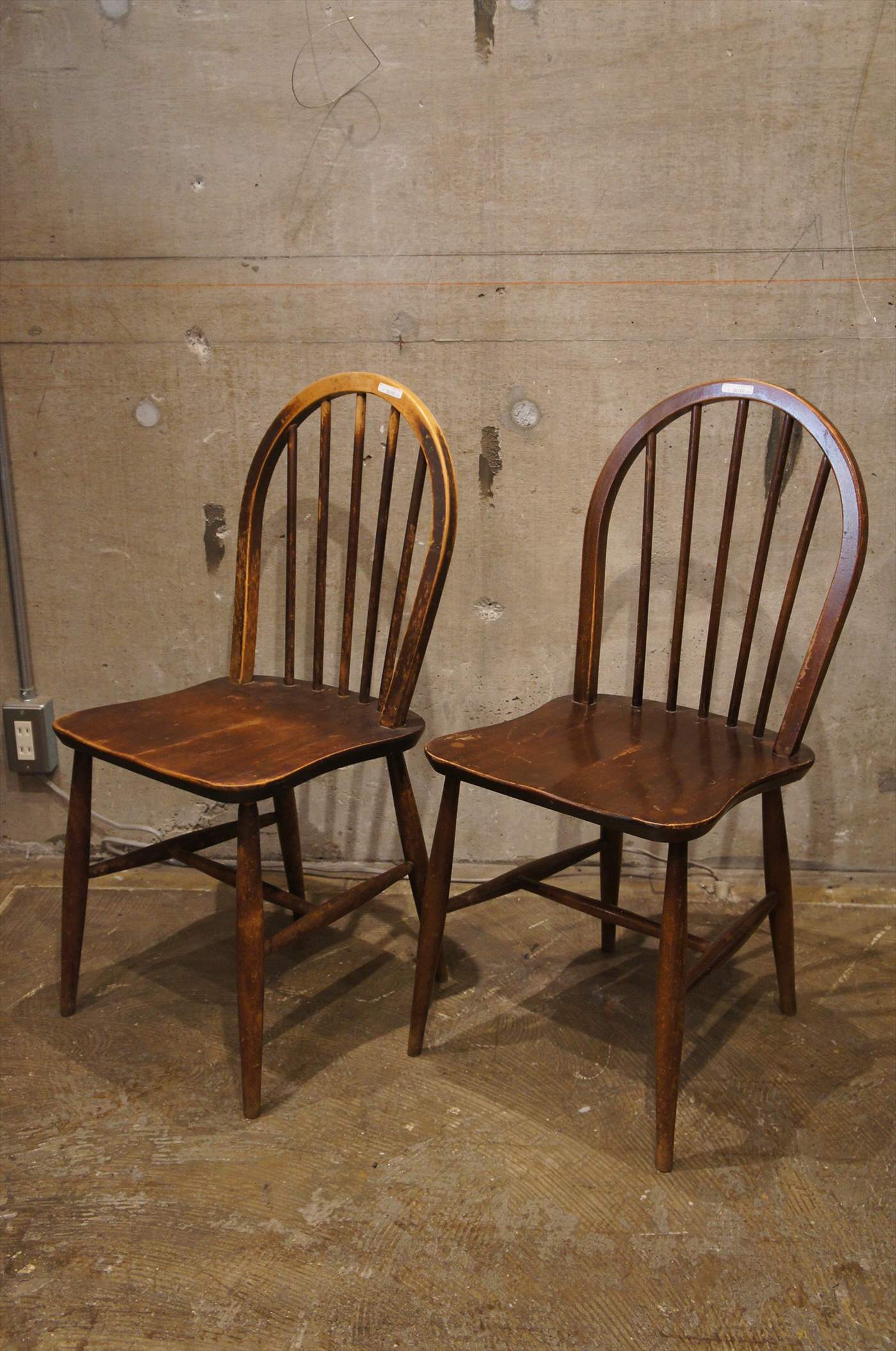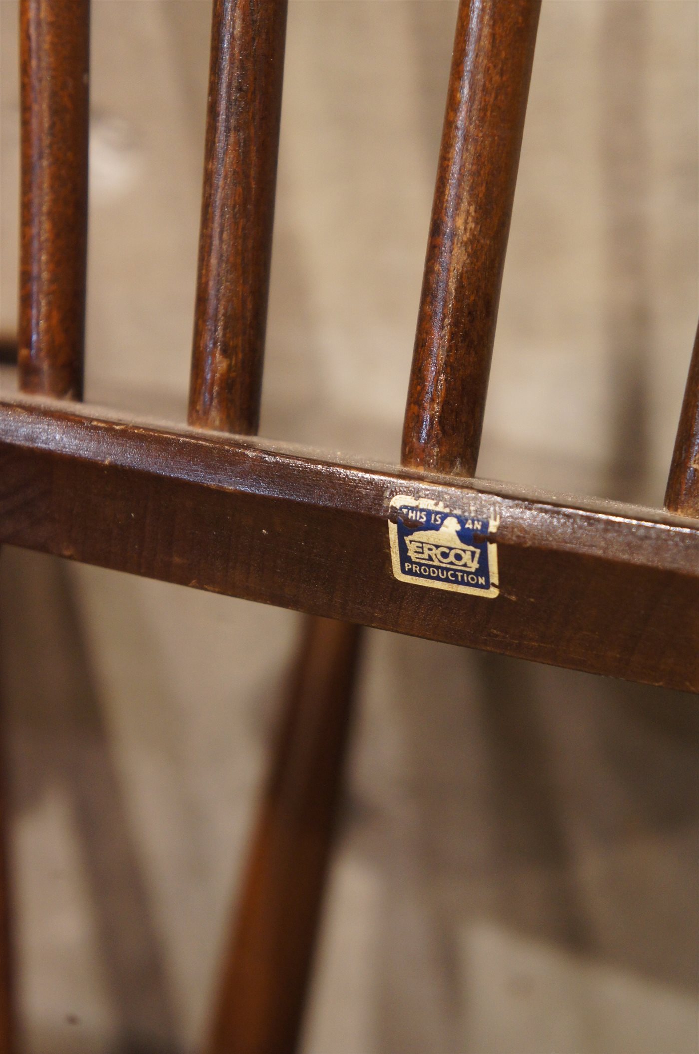 こちらの椅子は、初期デザインのもので、伝統的なウィンザーチェアに近いERCOLシリーズの中でも、シックなブラウンで、クラシックなたたずまい。座面がベル型で背もたれの貫が5本、脚部の貫の位置が流通量の多い後期モデルとは異なります。