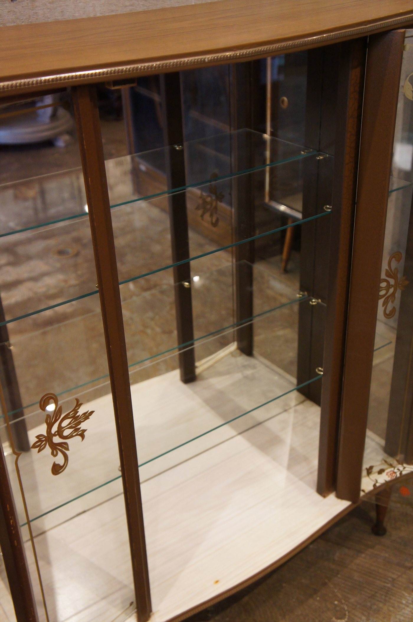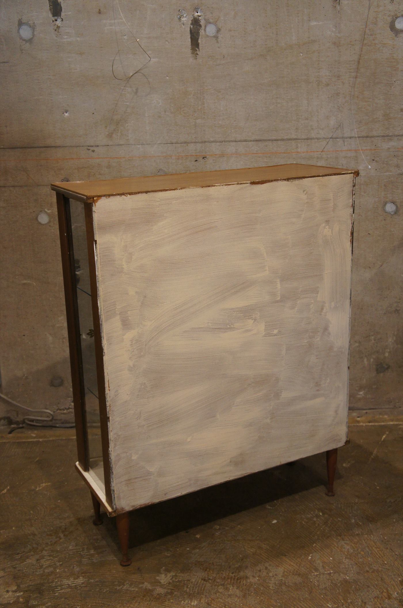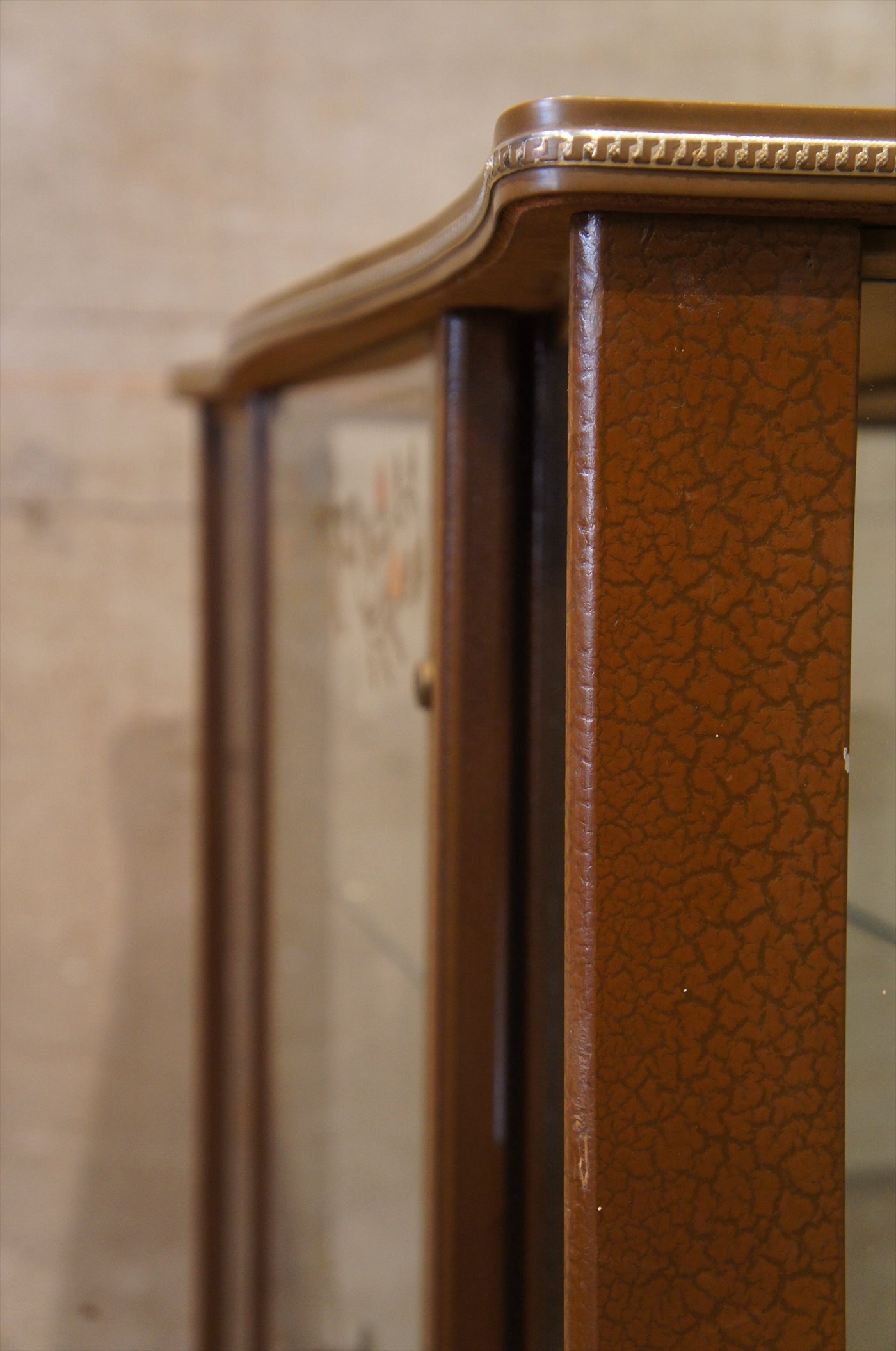 スマートな脚と、ウッドトップ、フレームはクロコ柄型押しのフェイクレザーで囲われています、ゴールドのトリム、ガラスのレタリングなど、なつかしくもスタイリッシュ。実用面でも、正面、側面はガラスで、採光に優れており、背面は鏡なので、飾る対象物がより美しく。サイズ、奥行きがコンパクトで、圧迫感も少なく、お部屋にインパクトを与えてくれます。