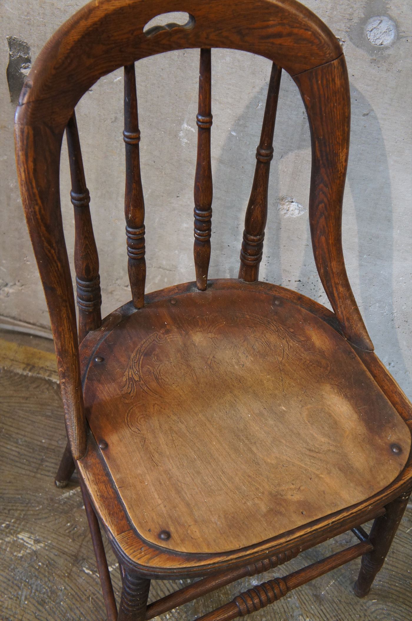 重厚な木材の大胆な曲線を描く背もたれ、後足がそのまま背貫へと続くデザイン、繊細な装飾、型押の座面。