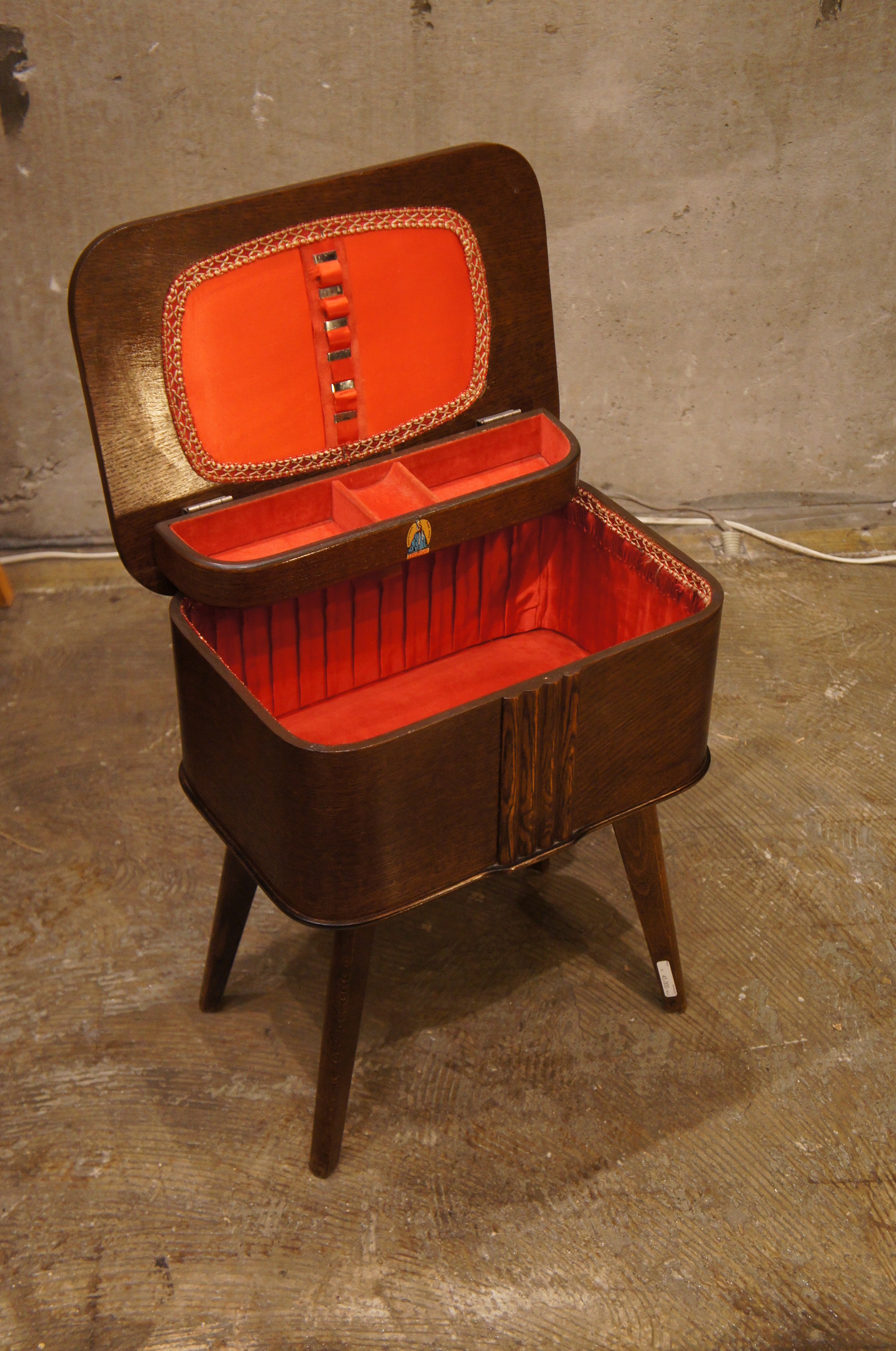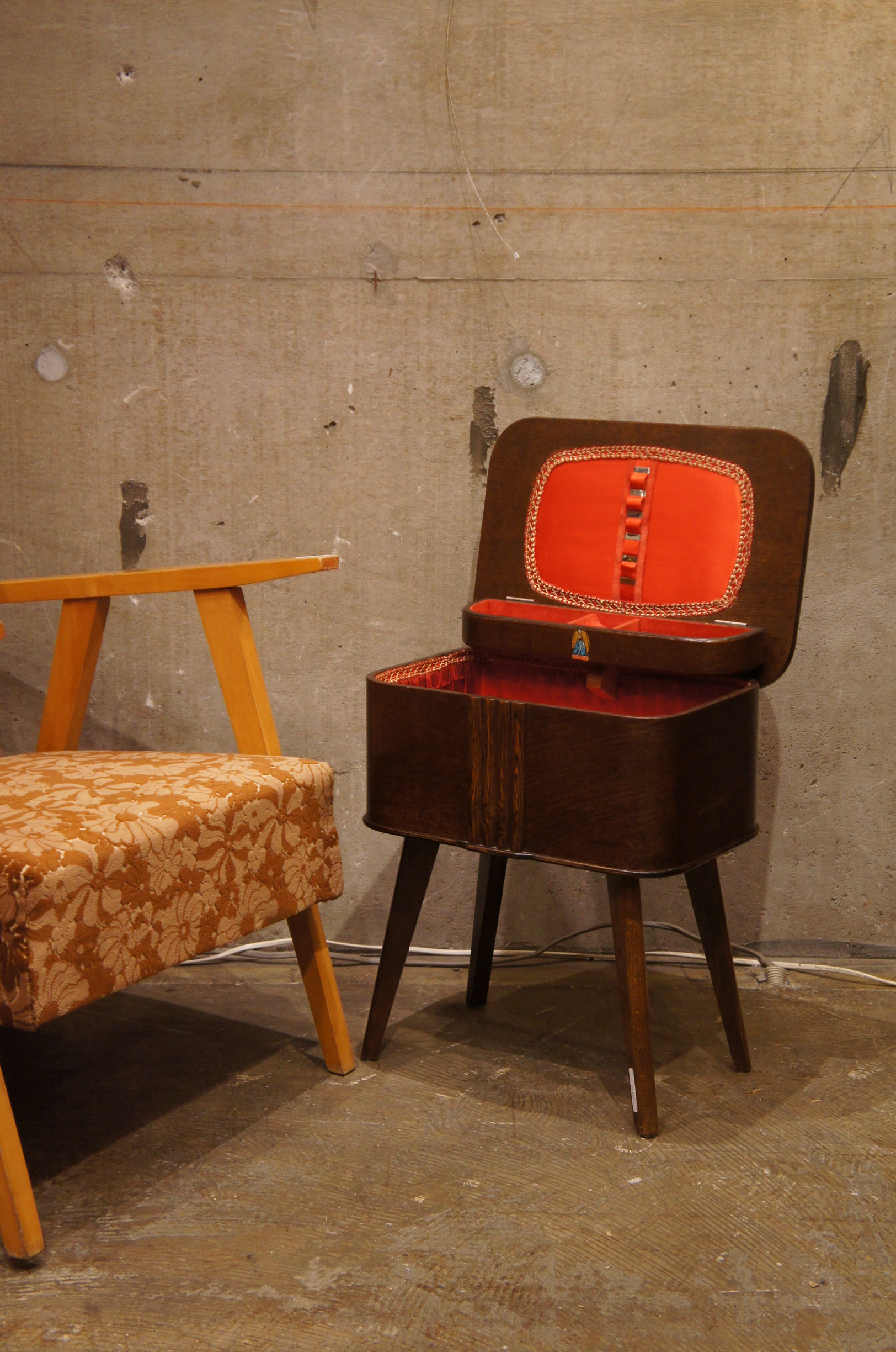 内張りの赤のベルベットが木材とのコントラストがいいです。